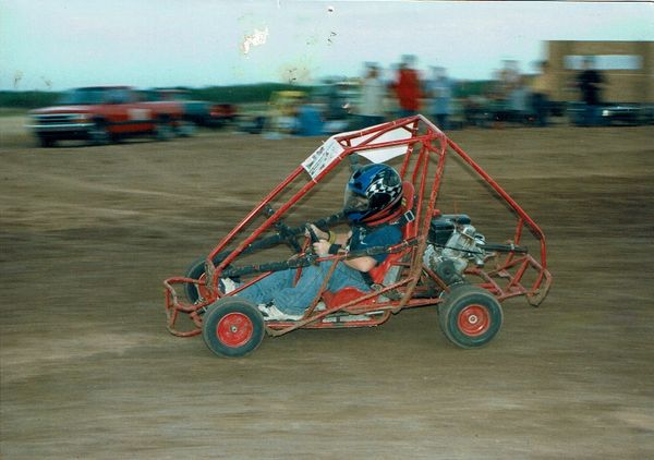 Quick glimpse of the kart racing, kart was designed and built by Sonny Miller from Smiley's Racing Products, driver is John Clark age-10 racing on our 1/12 mile track in 1999